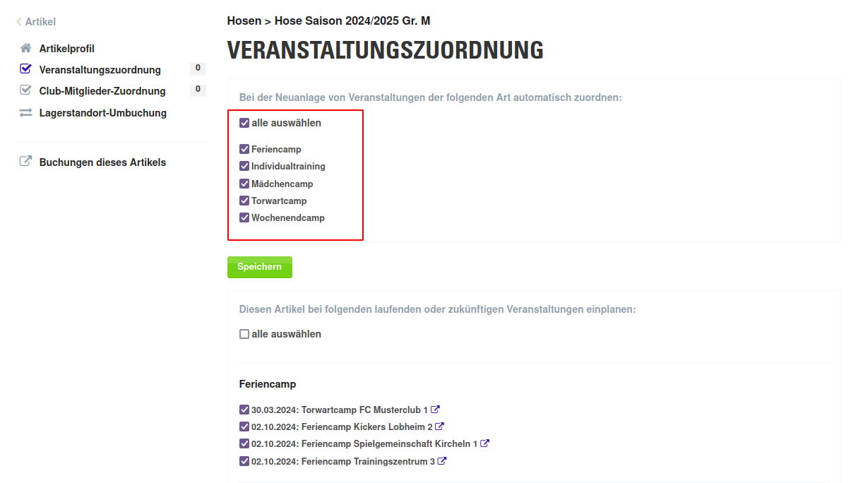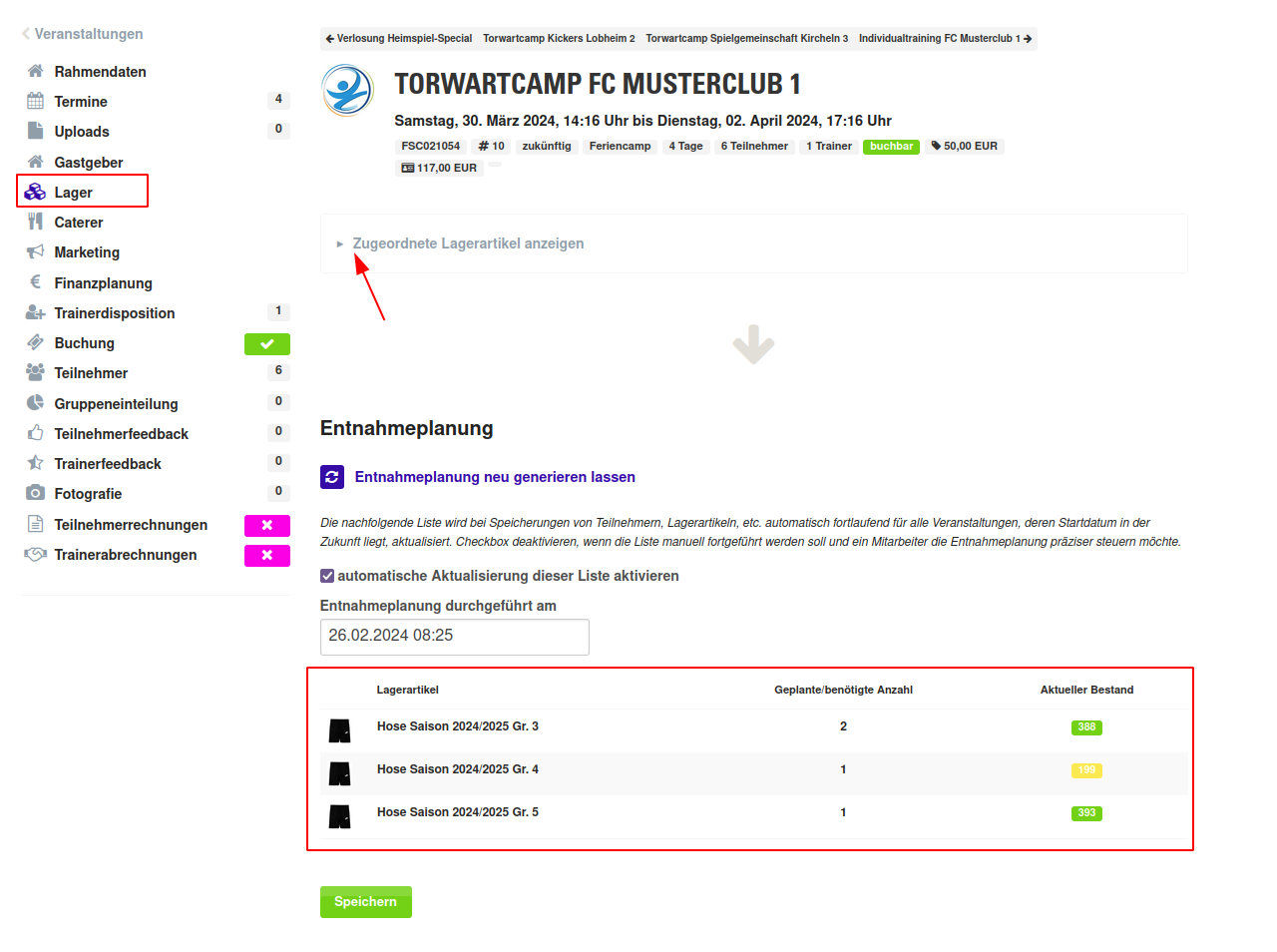 Lagerartikel können über die Veranstaltungsart oder die einzelne Veranstaltung in die Entnahmeplanung übernommen werden: