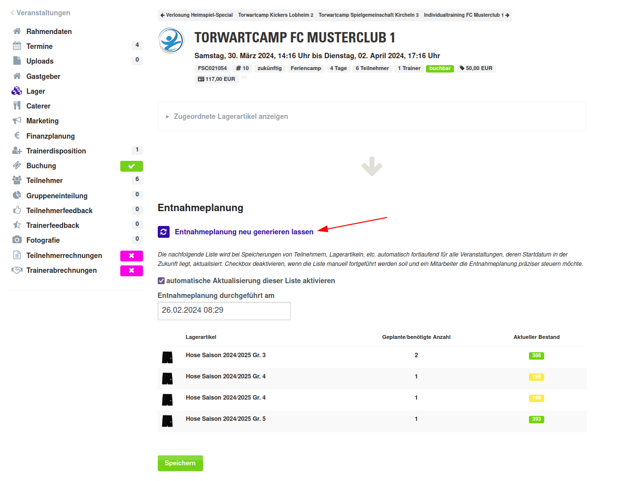 Die Entnahmeplanung der Veranstaltung aktualisiert sich automatisch, wenn neue Teilnehmer buchen, die Veranstaltung gespeichert oder ein Lagerartikel aktualisiert wird. Ansonsten kann die Entnahmeplanung für das Event auch immer über den Funktionslink "Entnahmeplanung neu generieren lassen" aktualisiert werden: