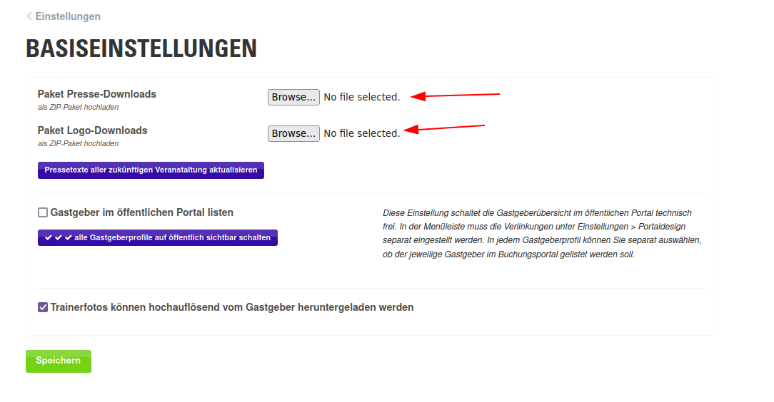 Unter Einstellungen > Gastgeber > Basiseinstellungen lassen sich dann noch zwei verschiedene ZIP-Dateien als generischer Upload für ein Presse- und ein Logopaket hochladen: