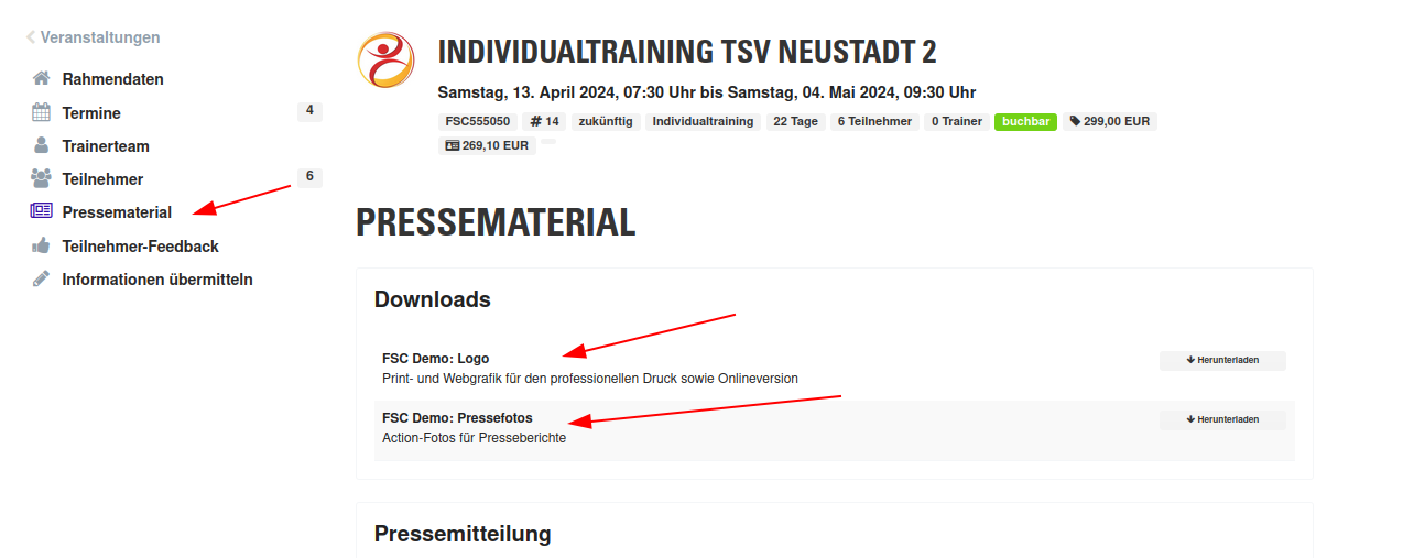 Im Gastgeberportal ist dann ein Zugriff auf das Pressematerial direkt über die Veranstaltung möglich: