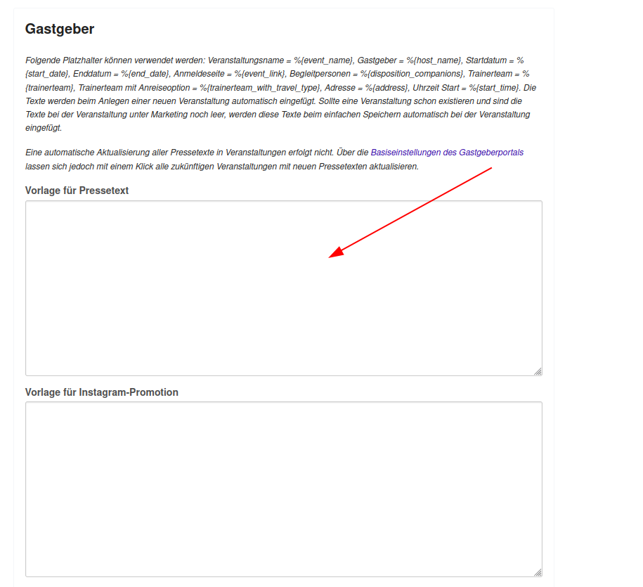 Die Pressetexte werden in der jeweiligen Veranstaltungsart mit Platzhalter-Variablen konfiguriert und können dann pro Veranstaltung individualisiert werden: