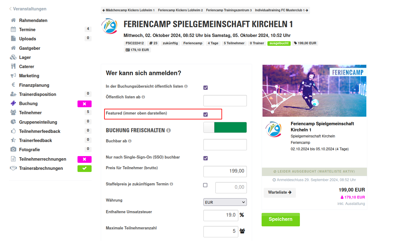 Sollen bestimmte Veranstaltungen oben in der Veranstaltungsliste angepinnt (unabhängig von der Datumssortierung) werden, kann hierfür unter Buchung die Checkbox Featured gesetzt werden: