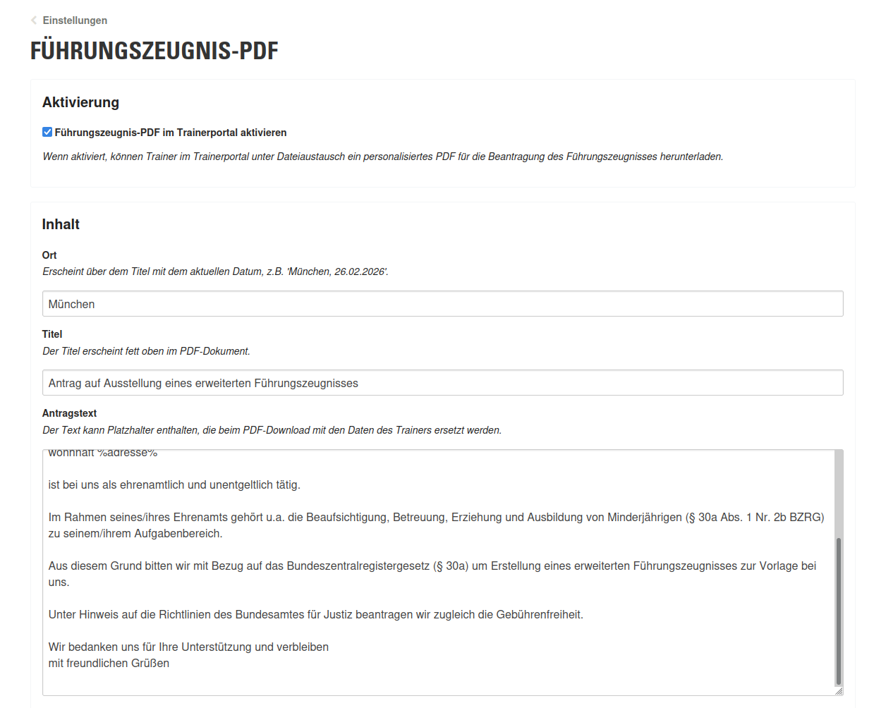 Der Prozess für die Anforderung von Führungszeugnissen sieht vor, dass die Trainer mit einem personalisierten Vordruck im zuständigen Amt ihres Wohnortes erscheinen. Um den Trainerinnen und Trainern ein vorgefertigtes PDF zur Verfügung zu stellen, das sie sich direkt über das Trainerportal herunterladen können, gibt es unter Einstellungen im Bereich Trainer die Option Führungszeugnisse.