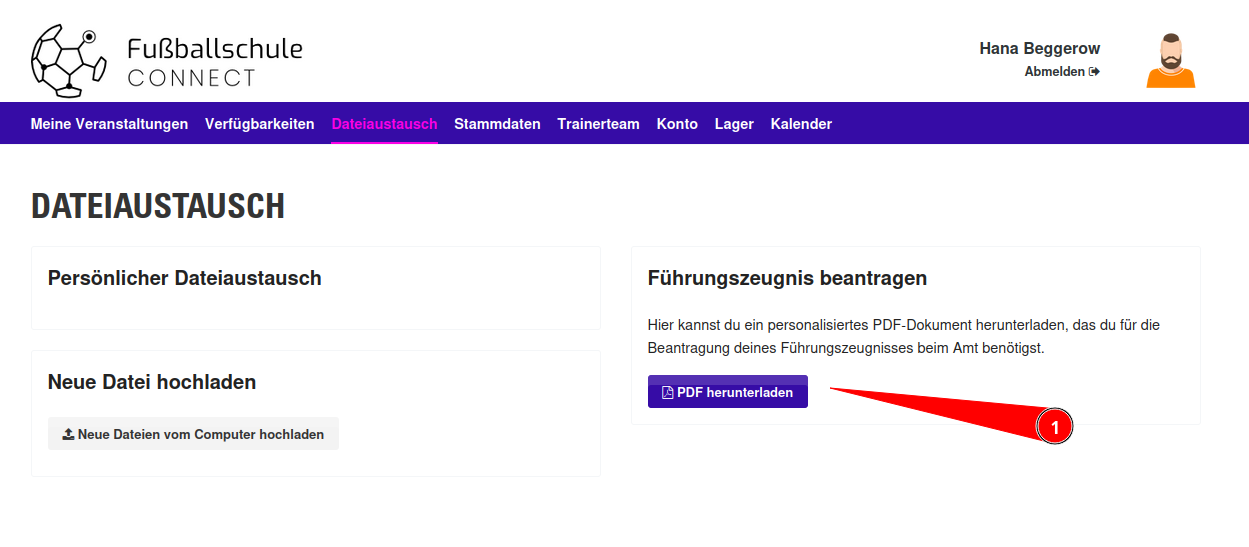 Ab Beginn der 8‑wöchigen Erinnerungsphase bzw. sofern noch kein Ablaufdatum für das Führungszeugnis hinterlegt ist, können Trainerinnen und Trainer im Trainerportal über den Reiter Dateiaustausch auf eine Downloadvorgabe des Vordrucks zugreifen und sich im Selfservice somit das Dokument herunterladen.