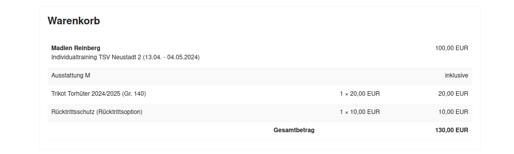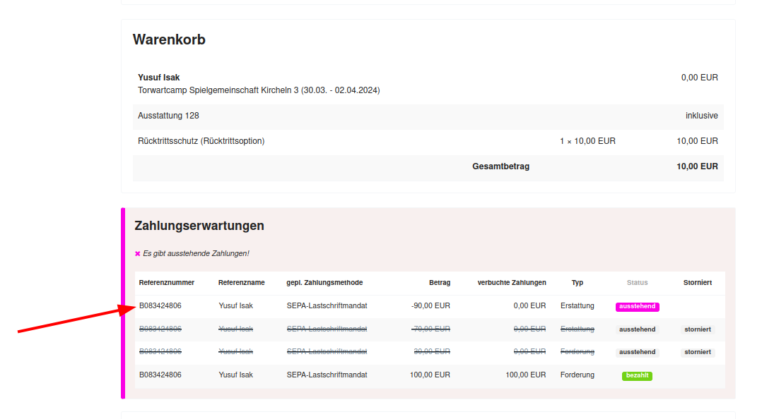 Ein Teilnehmer hat einen gemischten Warenkorb und bereits bezahlt. Nun soll der Teilnehmer storniert, aber ein Restbetrag bezahlt bzw. nur eine Teilerstattung ausgelöst werden. Der Warenkorb sieht z.B. wie folgt aus: