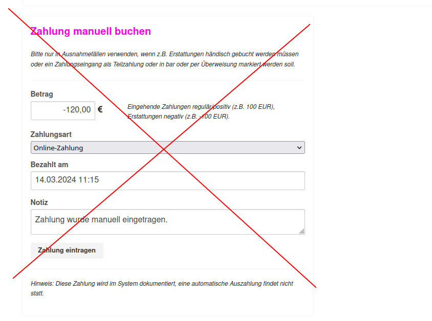 Wichtiger Hinweis: Bei Online-Zahlungen, die tatsächlich über die Schnittstelle zurückgehen sollen, reicht es nicht aus, die Zahlung händisch einzutragen. Dies dient nur der Dokumentation, stattdessen unbedingt den großen (meist grünen) Button zur Erstattung verwenden.
