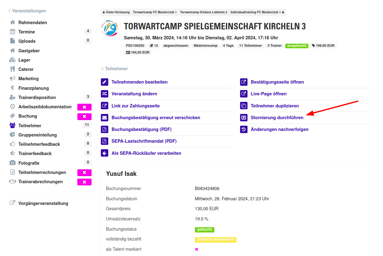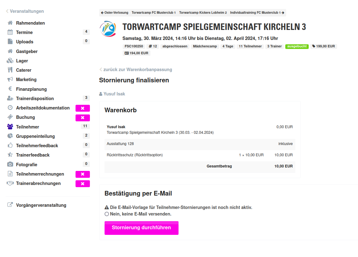 Teilstornierung: Teilnehmer Warenkorb abwerten und Erstattungen senden