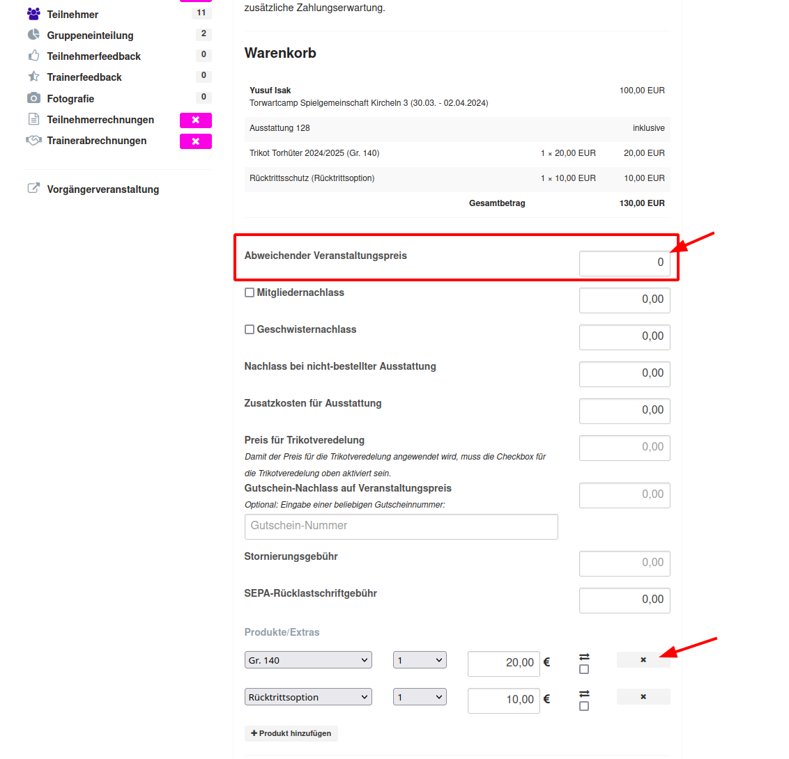 In diesem Fall soll nur der Rücktrittschutz im Warenkorb bleiben. Der Veranstaltungspreis wird auf 0,- gesetzt und eines der Produkte wird entfernt, der Rücktrittsschutz bleibt jedoch bestehen:
