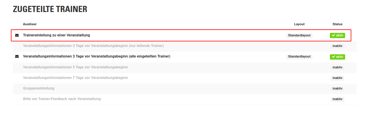 Die empfohlene Kommunikationsvariante besteht darin, das Trainerteam direkt nach Fertigstellung der Disposition per E-Mail zu informieren. Hierzu muss die E-Mail-Vorlage Trainereinteilung zu einer Veranstaltung aktiv sein:
