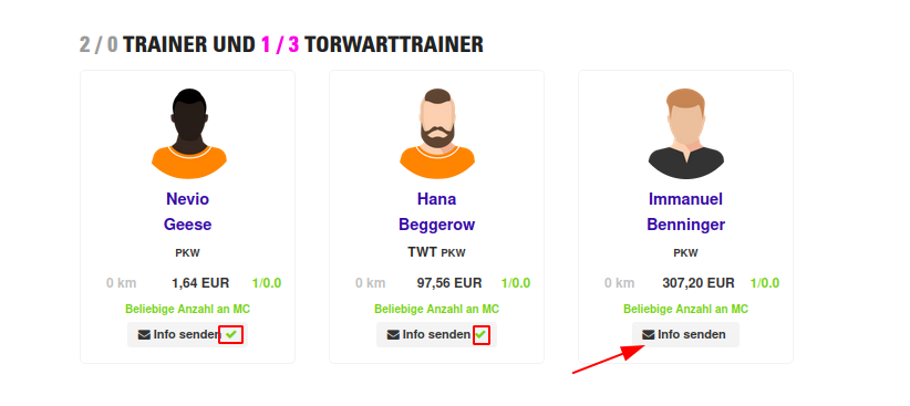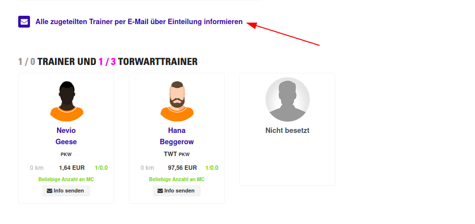 Rückt ein weiterer Trainer in das Team nach, kann dieser mit der Sonderfunktion Info senden innerhalb der Trainerkarte, über die Einteilung informiert werden. Anhand des kleinen grünen Pfeils ist zu erkennen, ob ein Trainer bereits über die Einteilung informiert wurde: