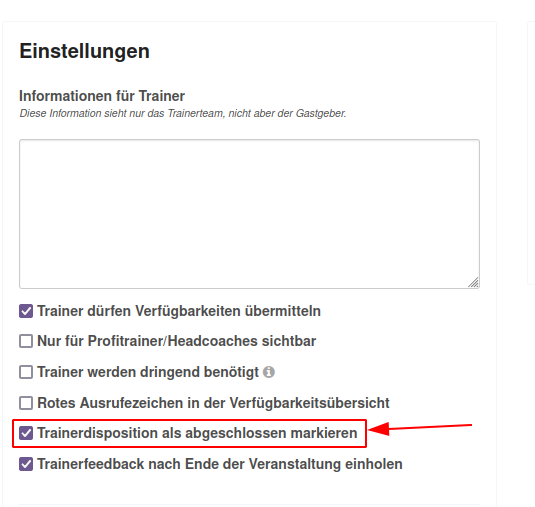 Im oberen Bereich der Trainereinteilung sollte auch die Checkbox Trainerdisposition als abgeschlossen markieren gesetzt werden: