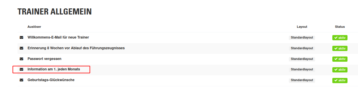 In den E-Mail-Vorlagen kann die Infomail am 1. eines Monats für Trainer aktiviert werden: