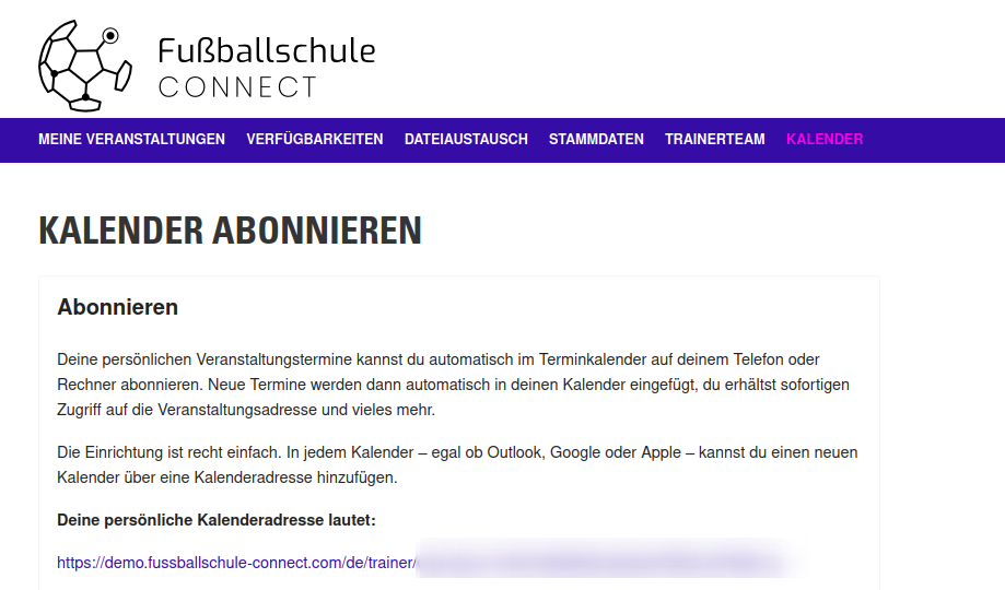 Über das Trainerportal haben die Trainer die Option, eine personalisierte Kalender-URL zu abonnieren. In diesem Fall aktualisieren sich alle fest zugeteilten Veranstaltungen automatisch und erscheinen im Kalender des Trainers: