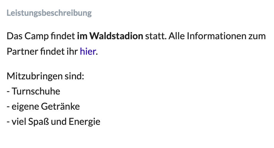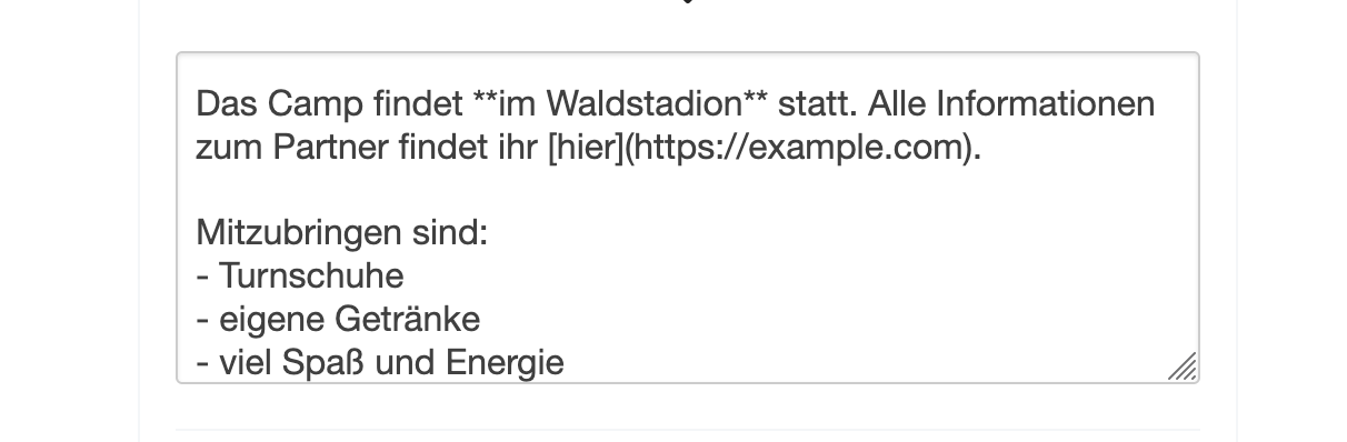 In vielen Textfeldern und in den E-Mail-Vorlagen können inline Formatierungen in der Markdown-Formatierung verwendet werden. Im Gegensatz zum Rich-Text werden in Markdown die Formatierungen nicht direkt als Vorschau sichtbar, sondern werden im Text als Zusatzsymbole ergänzt. Von Vorteil ist diese Formatierung, da wir systemseitig somit über Schnittstellen keinen HTML-Code ausliefern müssen, sondern jedes Zielsystem seine eigenen Formatierungen wie fetten oder kursiven Text auf die übermittelten Ausgaben legen kann.
