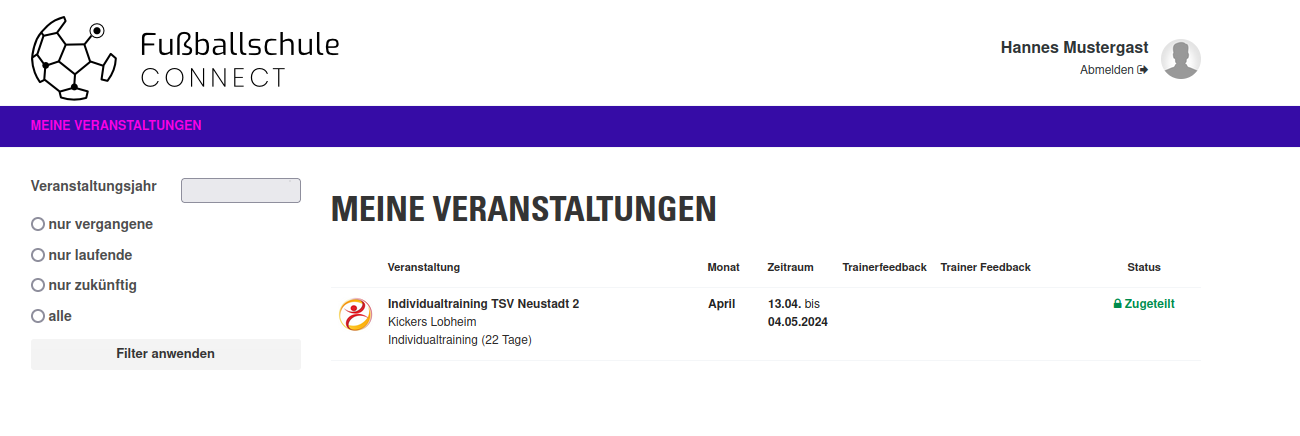 Um externe Trainer (z.B. von Partnervereinen) aktiv mit in die Events einzubinden, können diese als Gasttrainer angelegt werden. Gastgeber haben nur Zugriff auf den Bereich Meine Veranstaltungen und können somit keine Verfügbarkeiten übermitteln, Stammdaten ändern, usw.
