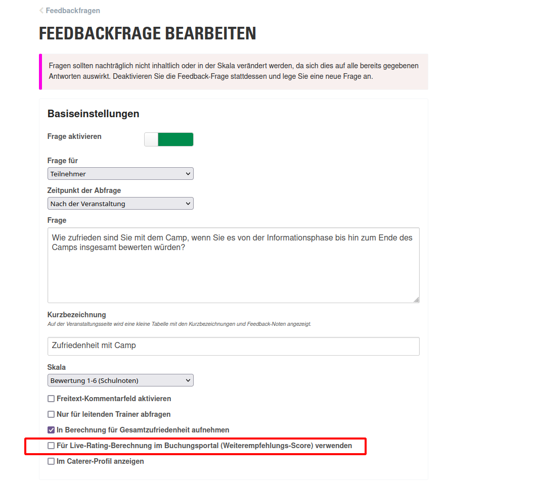 Um die Feedbackfragen zur Berechnungsgrundlage zu markieren, kann die Checkbox unter Feedbackfrage bearbeiten aktiviert werden:
