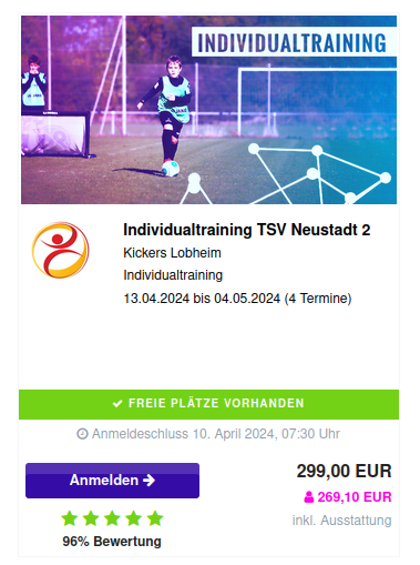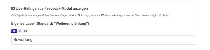 Im Buchungsportal kann unter dem Anmeldebutton ein automatisch berechneter Weiterempfehlungs-Score aus den Feedback-Antworten angezeigt werden.