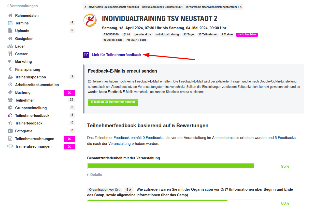 Feedback-E-Mails werden automatisch um 20:30 Uhr am letzten Veranstaltungstag an die Teilnehmer versendet. Sie können über den Bereich Teilnehmer-Feedback auch noch nachträglich manuell verschickt werden. Falls Feedback-E-Mails nicht erzeugt werden, kann dies drei Gründe haben: