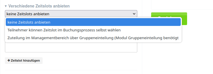 Hierbei kann gewählt werden, ob die Teilnehmer im ersten Buchungsschritt selbst die Zeitslots wählen oder die Zuteilung der Zeitslots im späteren Schritt manuell über das Gruppenmodul erfolgt.