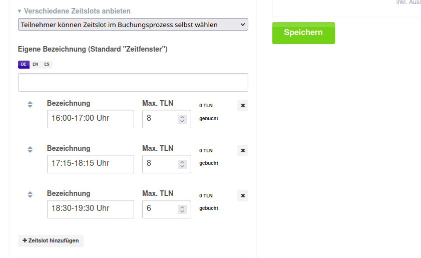 Die unterschiedlichen Zeitslots können angelegt und mit einer maximalen Teilnehmeranzahl versehen werden (greift nur in der Auswahl "Teilnehmer können Zeitslot im Buchungsprozess selbst wählen").