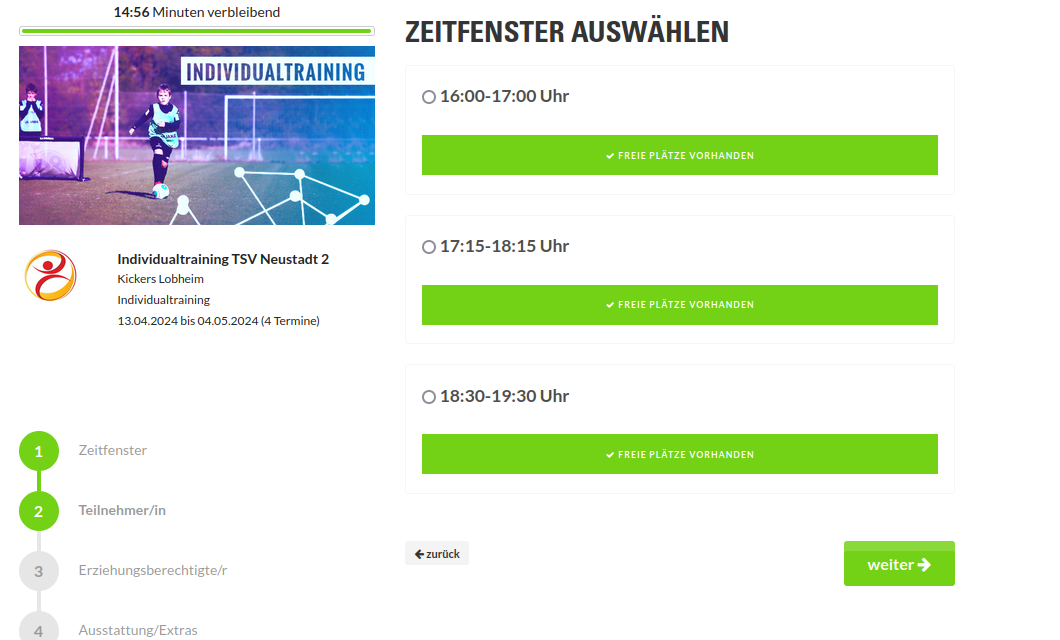 Im ersten Buchungsschritt können Zeitfenster mit unterschiedlichen Teilnehmerkapazitäten zur Auswahl angeboten werden.