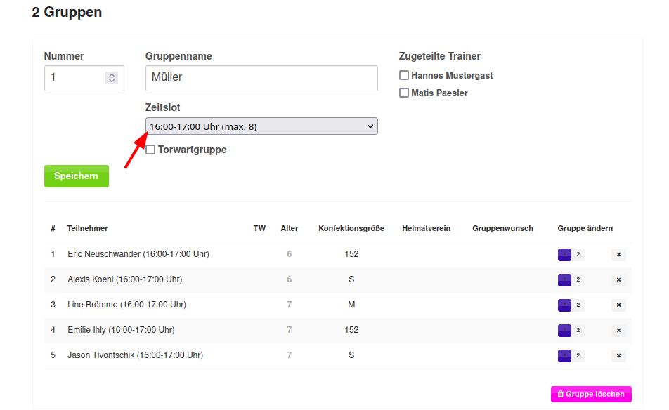 Nach der Erstellung der Gruppen kann einfach der passende Zeitslot gewählt werden, nach dem Speichern wird dann allen Teilnehmern in der Gruppe der Zeitslot zugeordnet: