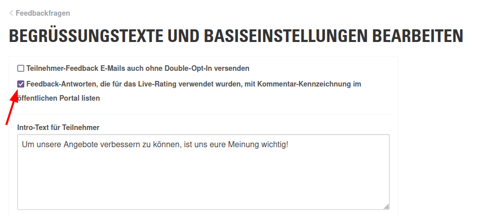 Um ausgewählte Kommentare aus dem Teilnehmer-Feedback zu Marketing-Zwecken im Buchungsportal zu listen, kann die Checkbox unter Einstellungen > Feedbackfragen > Begrüßungstexte und Basiseinstellungen bearbeiten aktiviert werden: