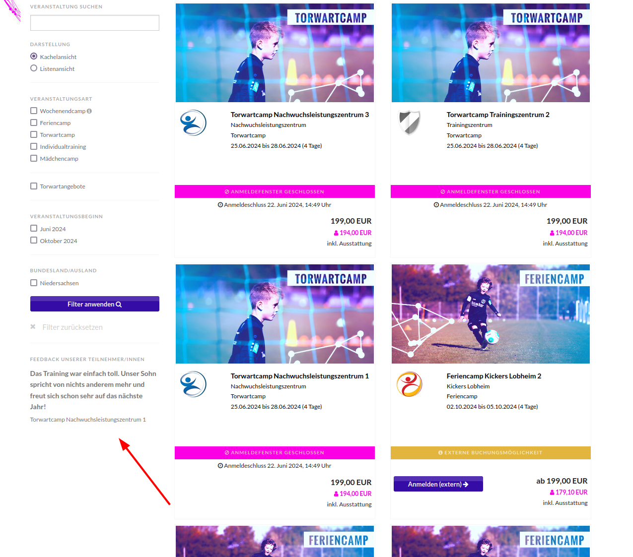 Die ausgewählten Kommentare werden nun zufällig (immer ein Kommentar) im Buchungsportal auf der linken Seite angezeigt: