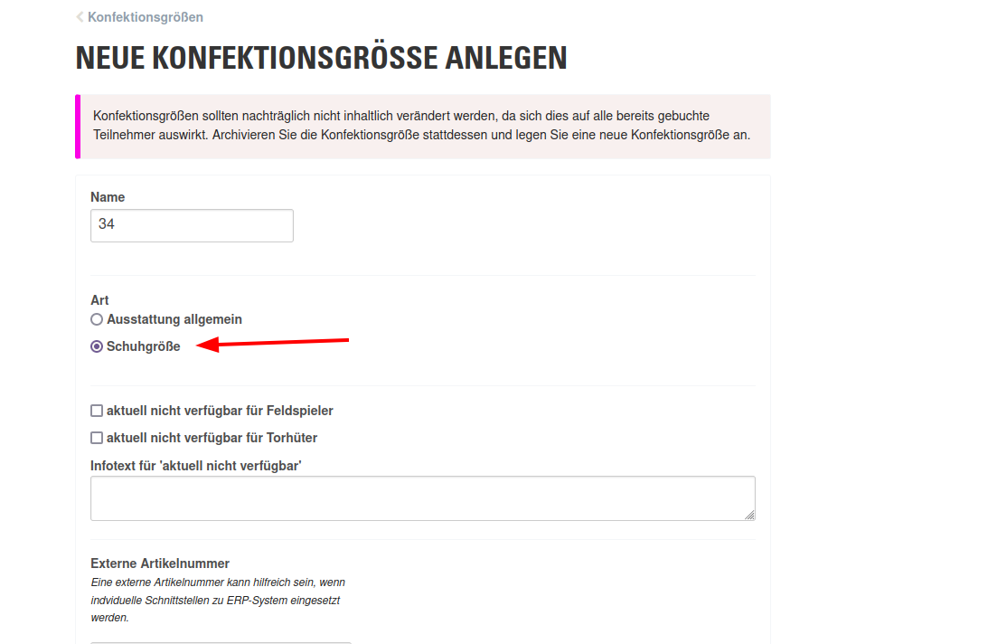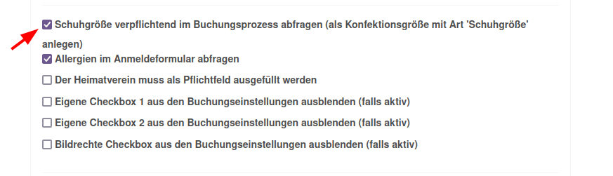 Innerhalb der Veranstaltungsart kann die Abfrage zur Pflichtangabe einer Schuhgröße zusätzlich per Checkbox aktiviert werden: