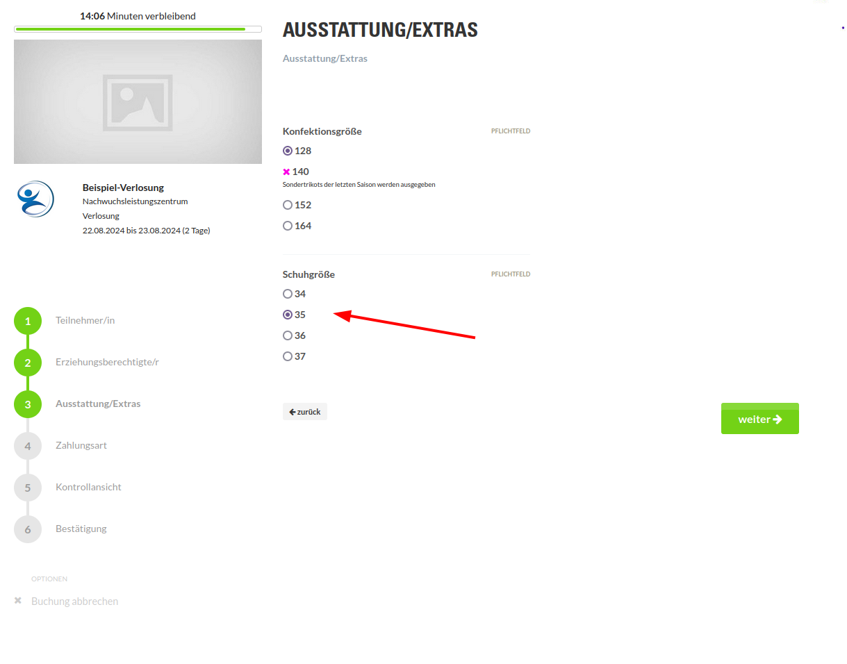 Im Buchungsprozess wird die Schuhgröße dann neben der Konfektionsgröße abgefragt und ist später in den Exporten verfügbar: