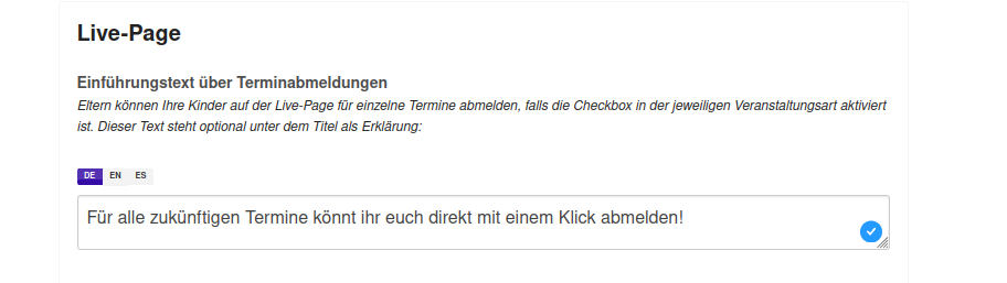 Unter Einstellungen > Buchungsportal lässt sich ein Introtext hinterlegen, der auf der Live-Page zwischen dem Titel und den einzelnen Termin im Bereich der Termin-Abmeldungen angezeigt wird.
