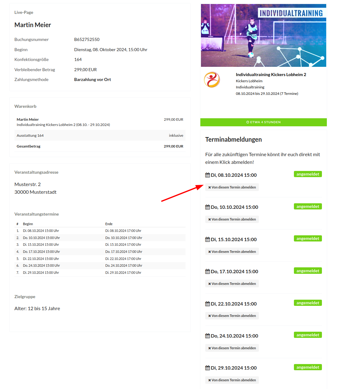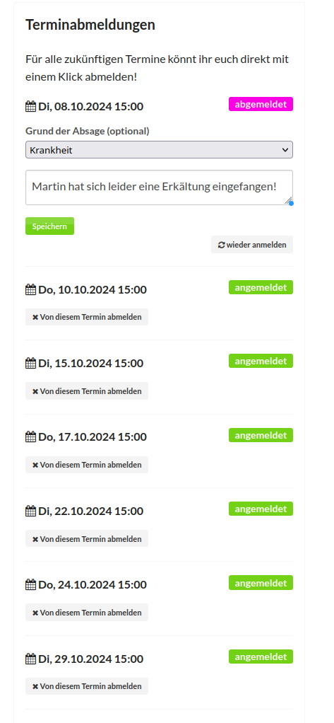 Teilnehmer können sich optional zu einzelnen Termin selbst über die Live-Page abmelden und müssen dies nicht telefonisch machen.