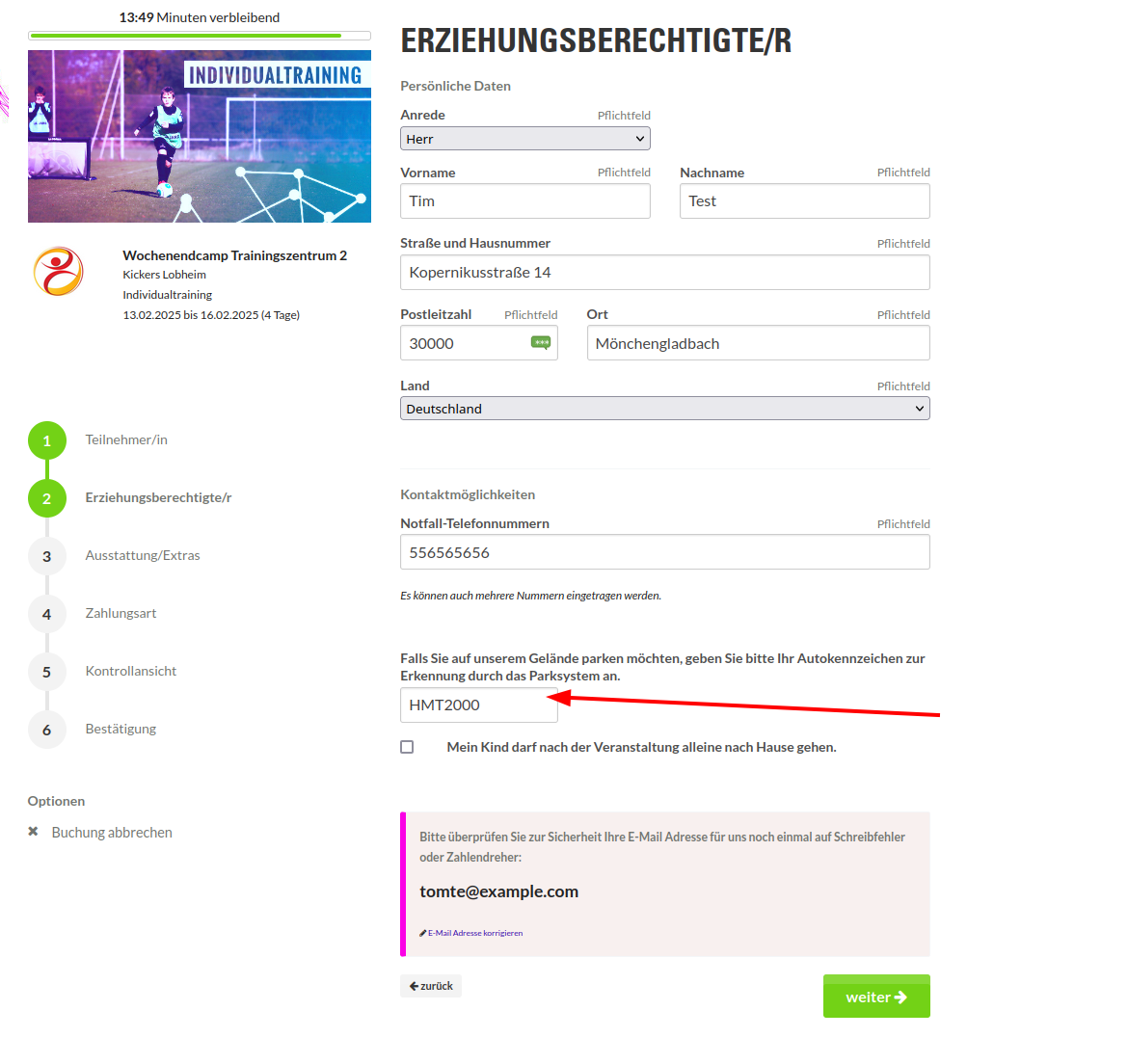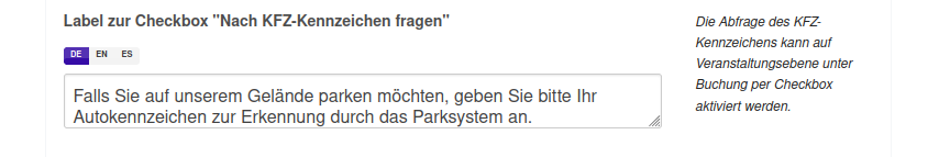 In den Buchungseinstellungen einer Veranstaltung kann per Checkbox optional das Kfz-Kennzeichen des Erziehungsberechtigten abgefragt werden: