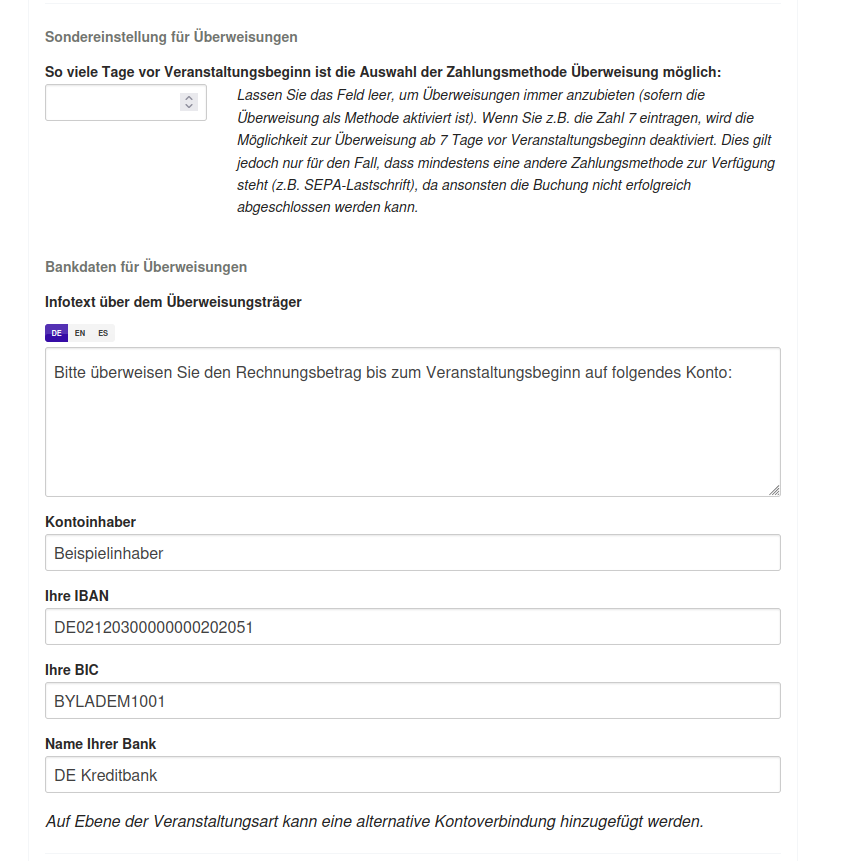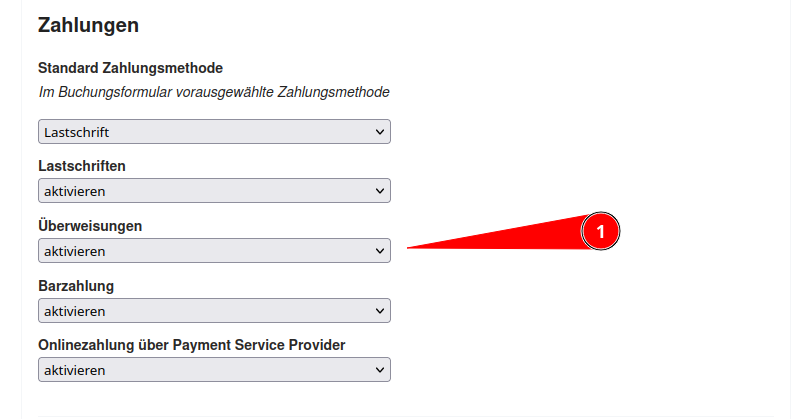 Die Zahlungsmethode Überweisung steht als Standardkomponente im Buchungsmodul zur Verfügung und kann unter Einstellung > Buchungsportal aktiviert werden.