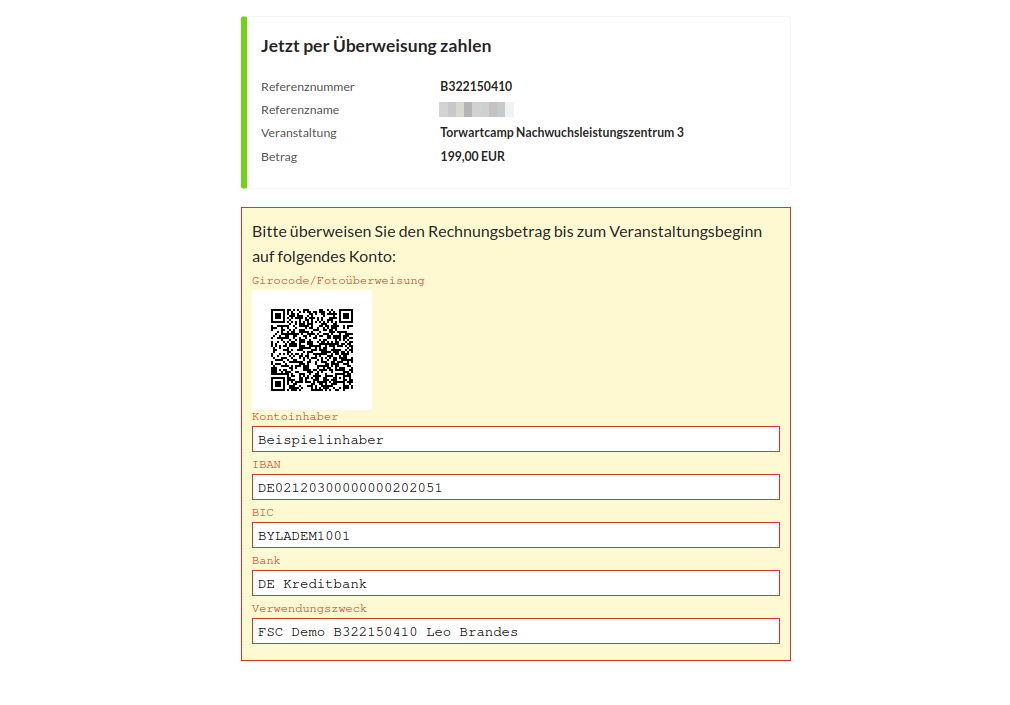 Die Software zeigt die Überweisungsdaten dann automatisch auf der Zahlungsseite an und stellt dort auch einen Giro-Code zur Verfügung, der von einer Banking-App eingelesen werden kann: