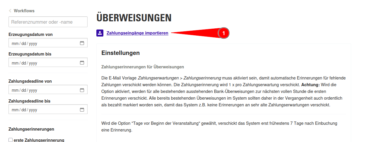Die Zahlungen gehen auf das angegebene Bankkonto ein und können nun per Import eines digitalen Kontoauszugs in Form einer Excel- oder CSV-Datei unter Workflows > Überweisungen > Zahlungseingänge importieren automatisiert eingelesen und abgeglichen werden.