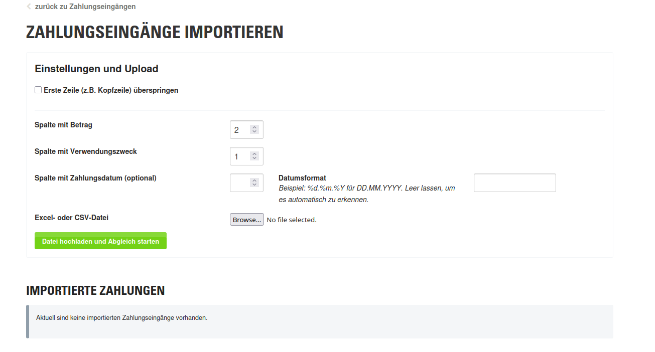 In der Grundkonfiguration lassen sich die Spaltennummern (entsprechend 1=A, 2=B, 3=C etc. in einer Excel-Tabelle) und das Datumsformat optional einmalig einstellen. Im unteren Bereich kann dann die Excel- oder CSV-Datei ausgewählt werden und durch Klick auf den Button wird der Import- und Abgleich-Prozess angestoßen.