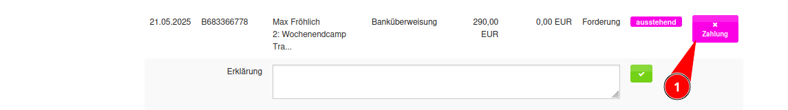 Besonders dann, wenn Eltern z.B. für Geschwisterkinder oder Mehrfachbuchungen gesammelt überweisen, ist eine kurze händische Nacharbeit notwendig. Dazu kann auf der Seite der Zahlungseingänge mit einem einfachen Klick die Zahlung manuell eingetragen werden.