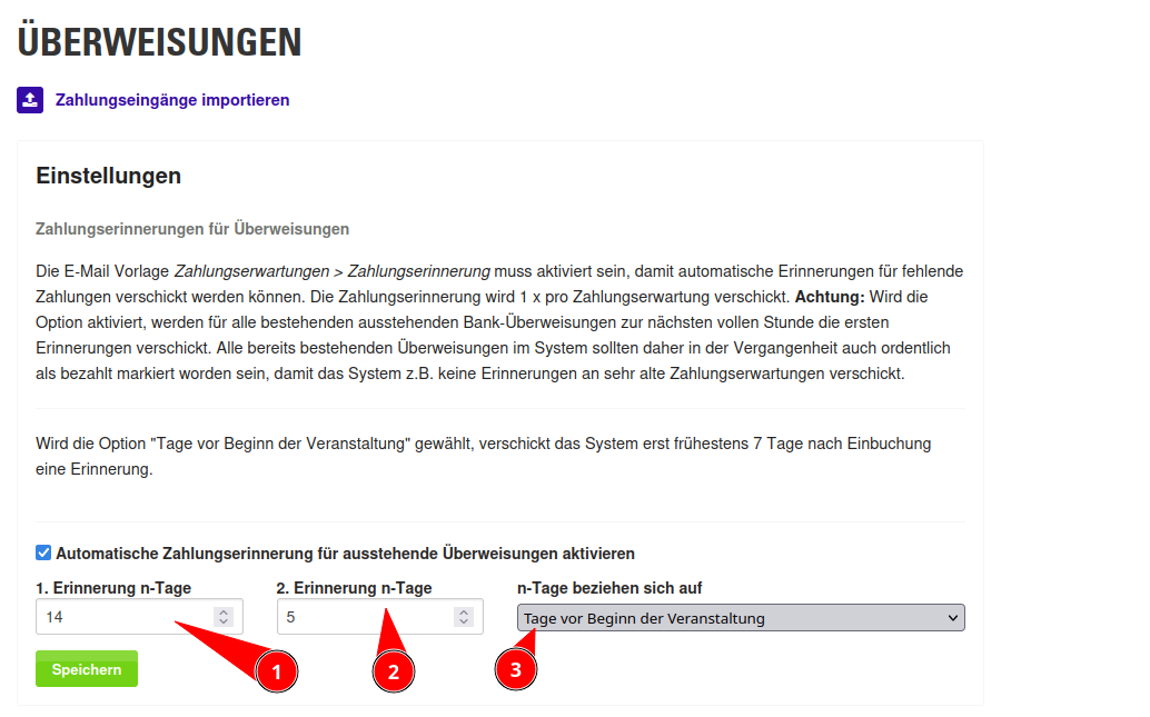 Auch Zahlungserinnerungen lassen sich bei Überweisungen automatisch verschicken, hierzu werden die E-Mail Vorlagen 1. und 2. Zahlungserinnerung im Bereich der Zahlungserwartungen verwendet. Im oberen Bereich können die Schwellenwerte für die 1. und 2. Erinnerung in Tagen in Bezug auf den Veranstaltungsbeginn oder das Buchungsdatum definiert werden.
