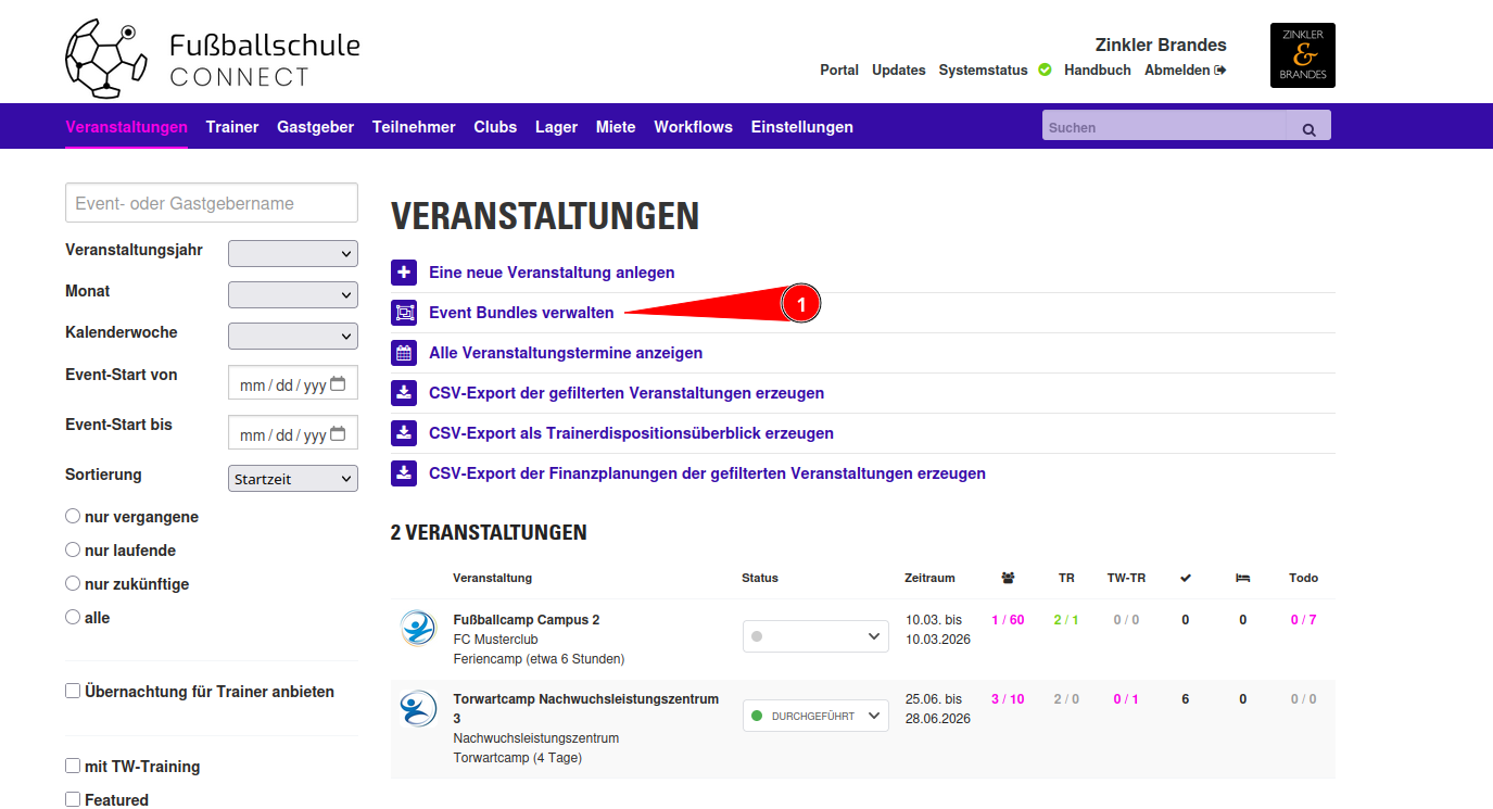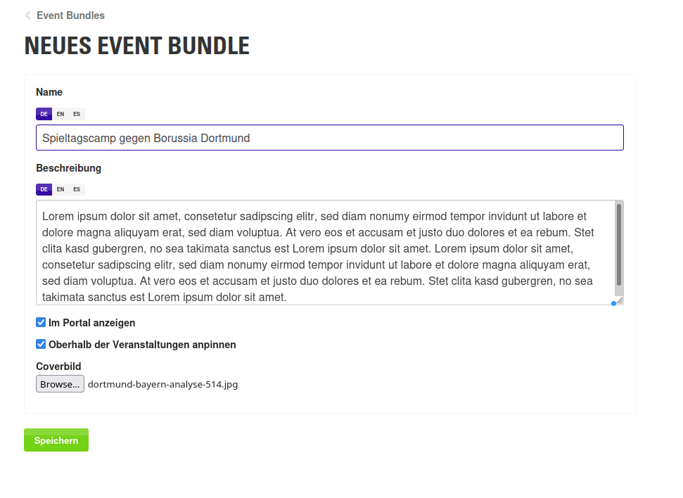 Wenn es im Buchungsportal viele Veranstaltungen gibt und diese für den Endkunden thematisch gruppiert werden sollen, können im Managementbereich innerhalb der Veranstaltungsdatenbank hierfür Event-Bundles angelegt werden.