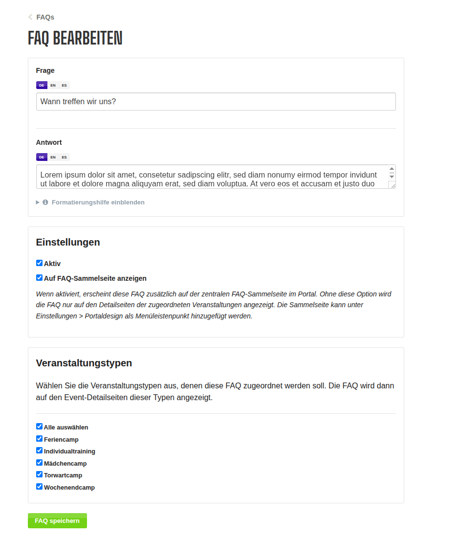 Um im Buchungsportal häufige Fragen zu den passenden Veranstaltungsarten anzeigen zu können, werden diese im Managementbereich in den Einstellungen unter Öffentliches Portal konfiguriert.