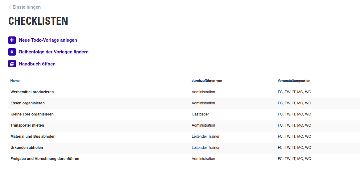 Ihr könnt unter Einstellungen > Checklisten einzelne To-dos anlegen und diese auch zu Veranstaltungsarten individuell einschränken. Weiterhin könnt ihr festlegen, welche Partei (Administration = Back Office, leitender Trainer oder Gastgeber) die Aufgabe zugeordnet bekommt. Administratoren können übrigens alle To-dos abhaken, leitende Trainer und Gastgeber hingegen können nur ihre eigenen To-dos abhaken.