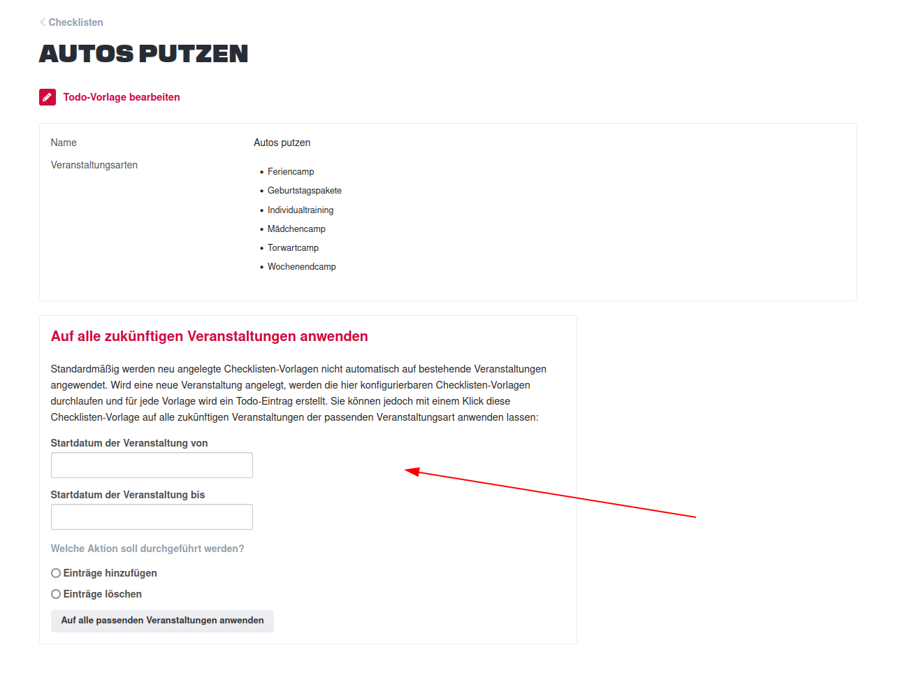 Checklisten-Vorlagen können auf der Detailseite mit wenigen Klicks für Veranstaltungen in einem definierten Zeitraum hinzugefügt und entfernt werden:
