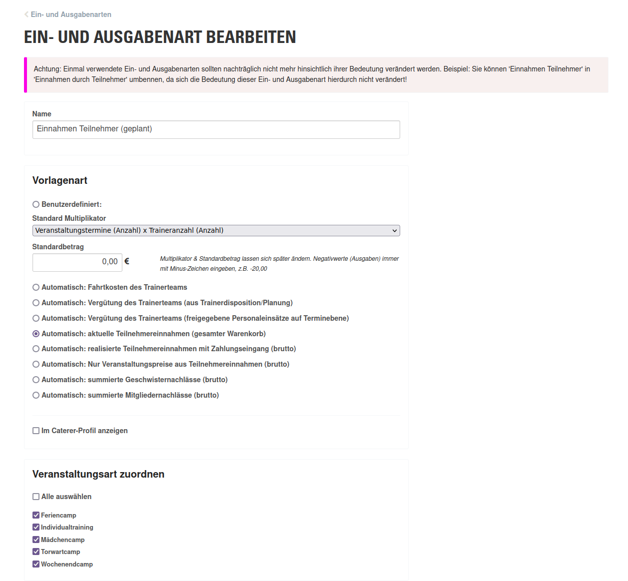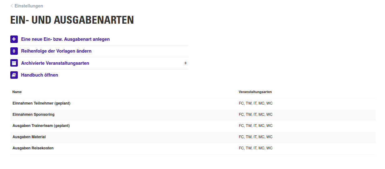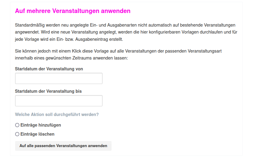 Standardmäßig werden neu angelegte Ein- und Ausgabenarten nicht automatisch auf bestehende Veranstaltungen angewendet. Wenn eine neue Veranstaltung angelegt wird, werden die hier konfigurierbaren Vorlagen durchlaufen und für jede Vorlage wird ein Ein- bzw. Ausgabeneintrag erstellt.