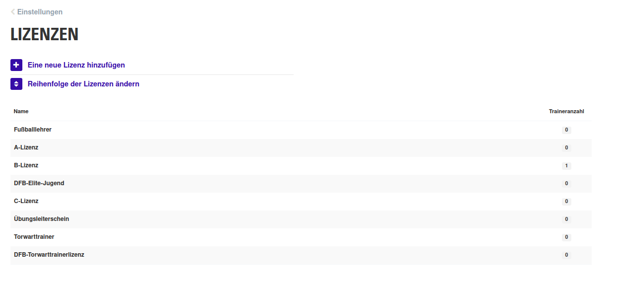 Unter Einstellungen > Trainerportal > Lizenzen könnt ihr die unterschiedlichen Lizenztypen anlegen. Je nach Sportart unterscheiden sich hier die Arten, daher habt ihr die Möglichkeit, selbst Lizenzen oder Qualifikationen abzufragen.