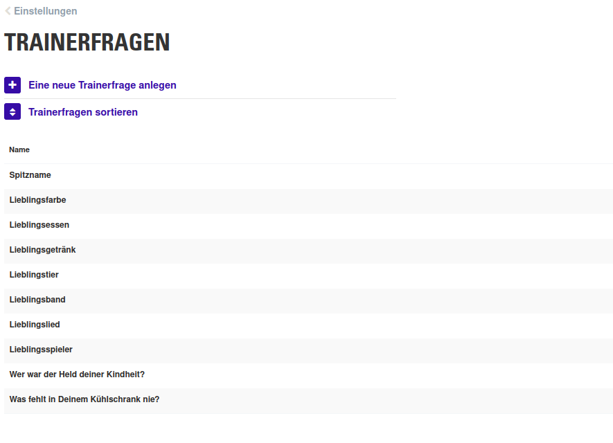 Unter Einstellungen > Trainerportal > Trainerfragen könnt ihr einen allgemeinen Fragebogen für Trainer hinterlegen, z.B. um eine Art Steckbrief für die Teilnehmer bei Events zu erstellen ("Welches ist dein Lieblingsessen?").