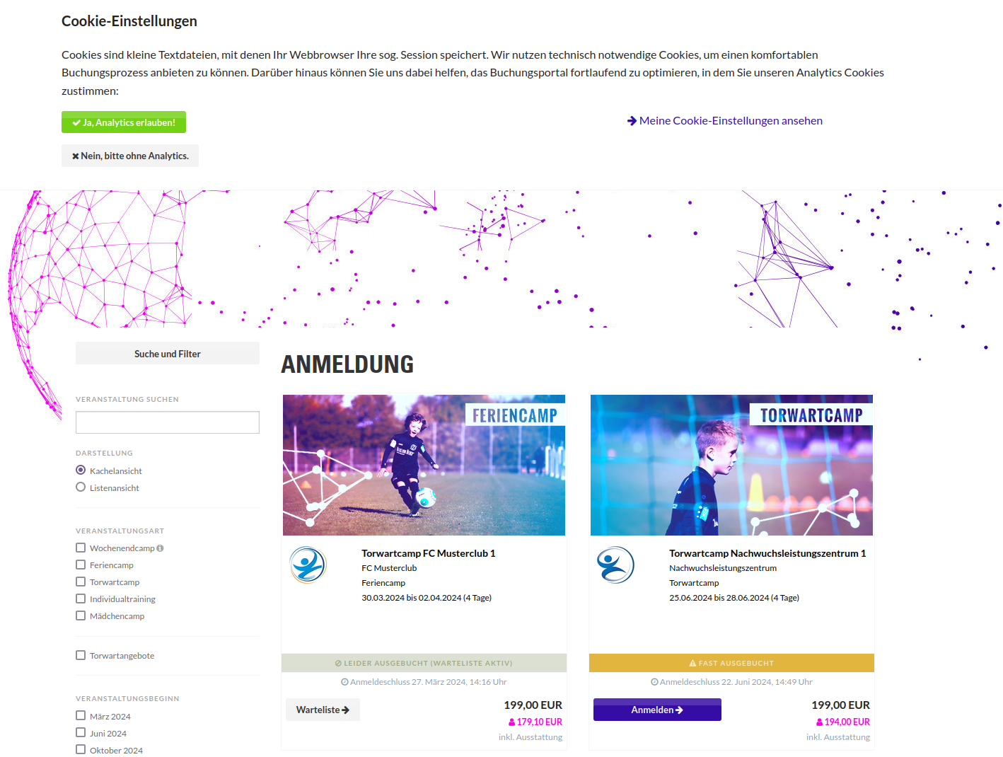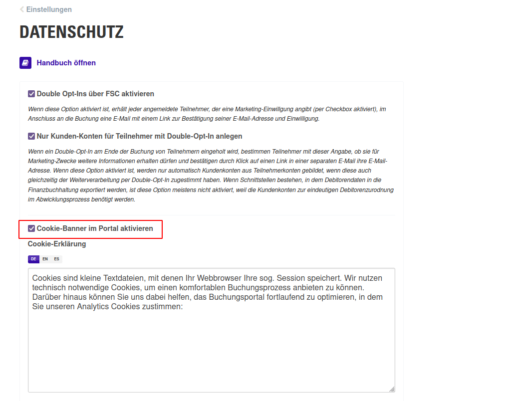 FSC kommt mit einer eigenen Cookie-Banner-Lösung, die unter Einstellungen > Datenschutz aktiviert werden kann, sofern externe Tracking-Skripte unter Einstellungen > Portal Design hinterlegt wurden.
