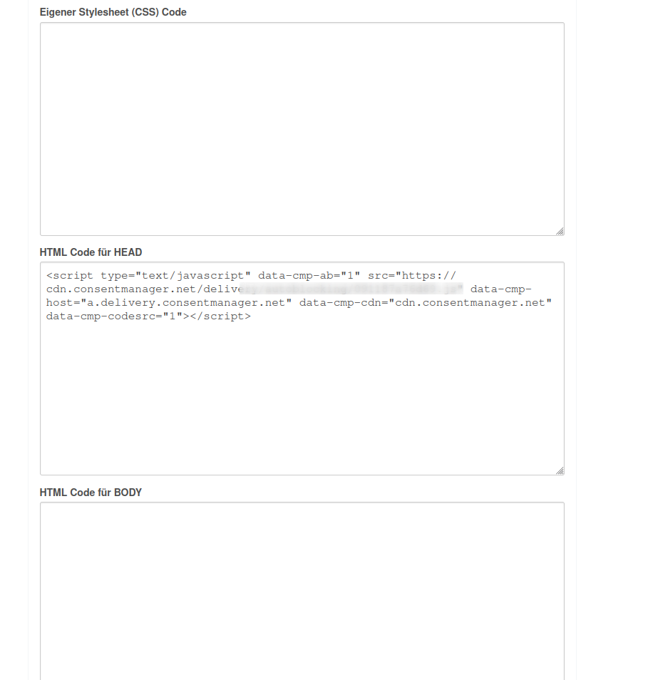 Unter Einstellungen > Portal Design lassen sich eigene HTML Codes für den head und body Bereich einfügen. Hier können auch Skripte für eigene Consent-Lösungen eingebunden werden: