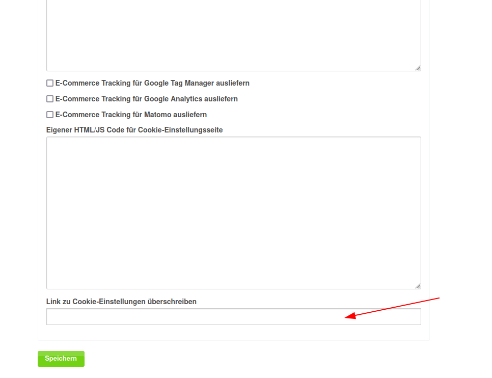 Weiterhin kann der Link zu den Cookie-Einstellungen weiter unten auf der Seite überschrieben werden (falls der Consent-Manager eine eigene Einstellungsseite bietet):