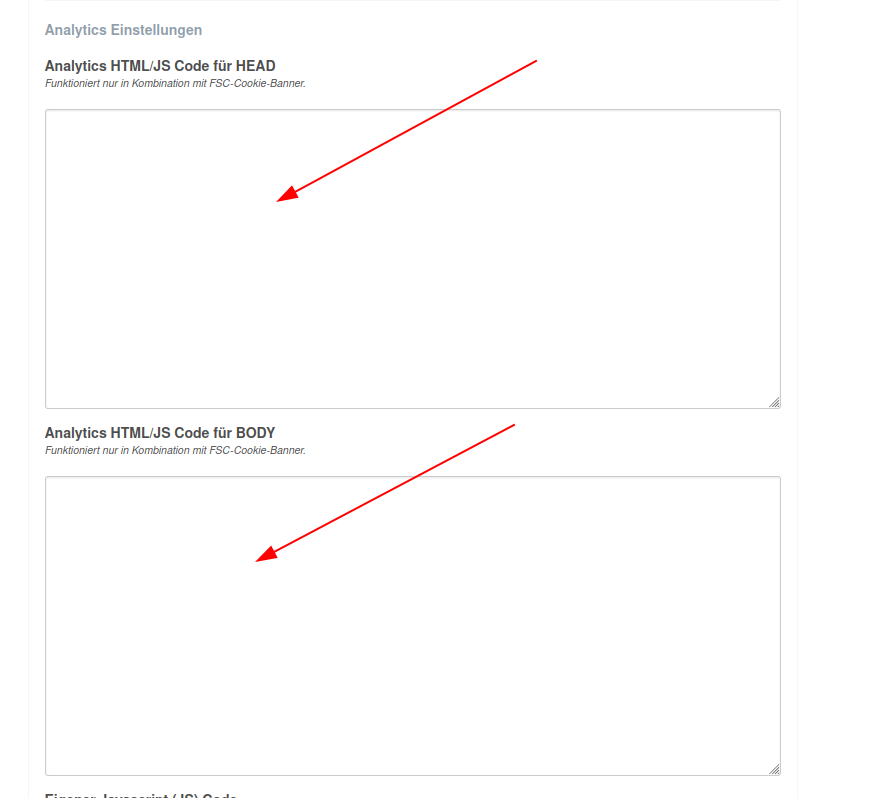 Soll der Analytics Code nur ausgeliefert werden, wenn per FSC Cookie-Banner (siehe unten) zugestimmt wurde, muss der Code weiter unten bei Analytics HTML/JS Code für HEAD/BODY eingefügt werden: